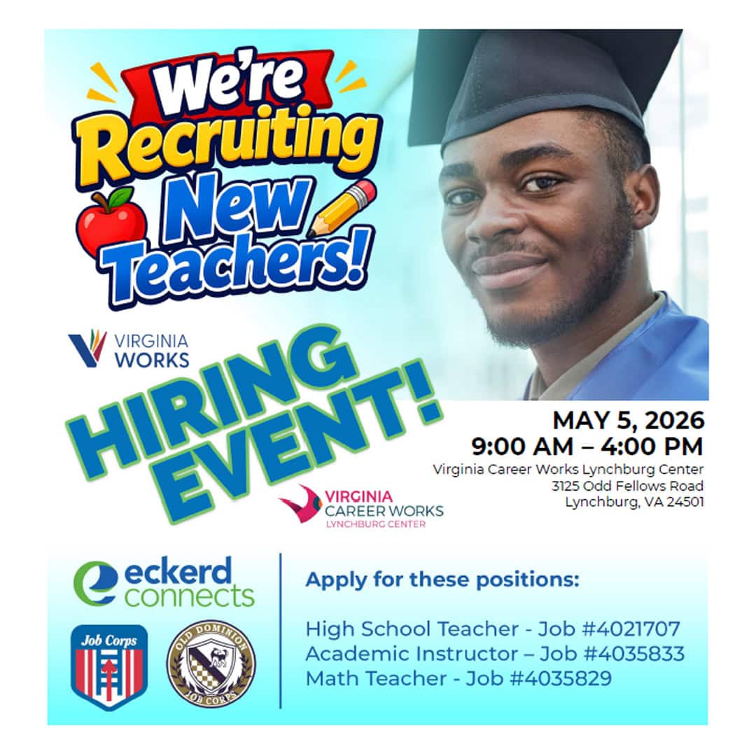 Eckerd Connects is hosting a Hiring Event for teaching positions at the Old Dominion JobCorps Center on Tuesday, May 5 from 9 a.m. to 4 p.m. at the Virginia Career Works Lynchburg Center, located at 3125 Odd Fellows Road in Lynchburg.
